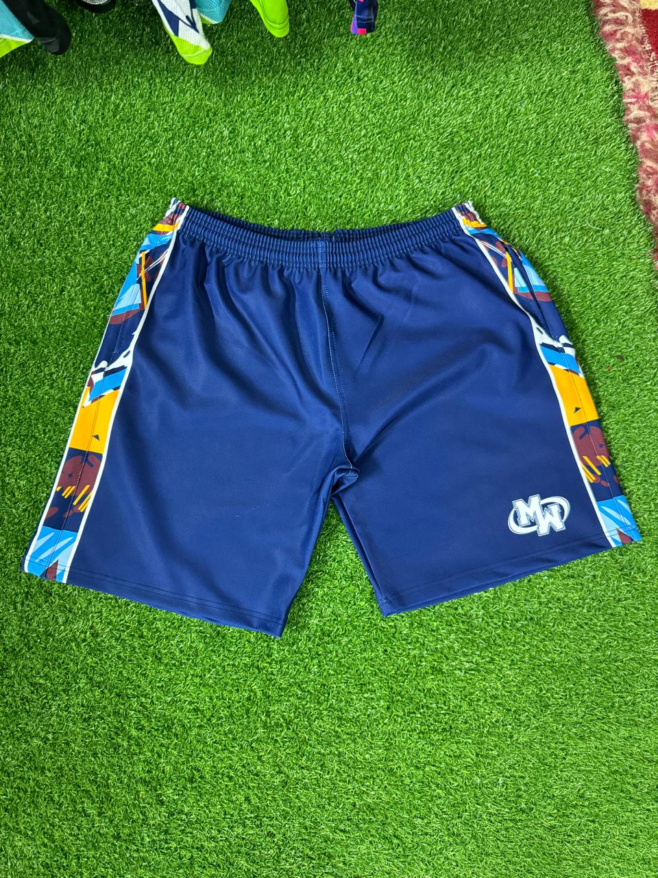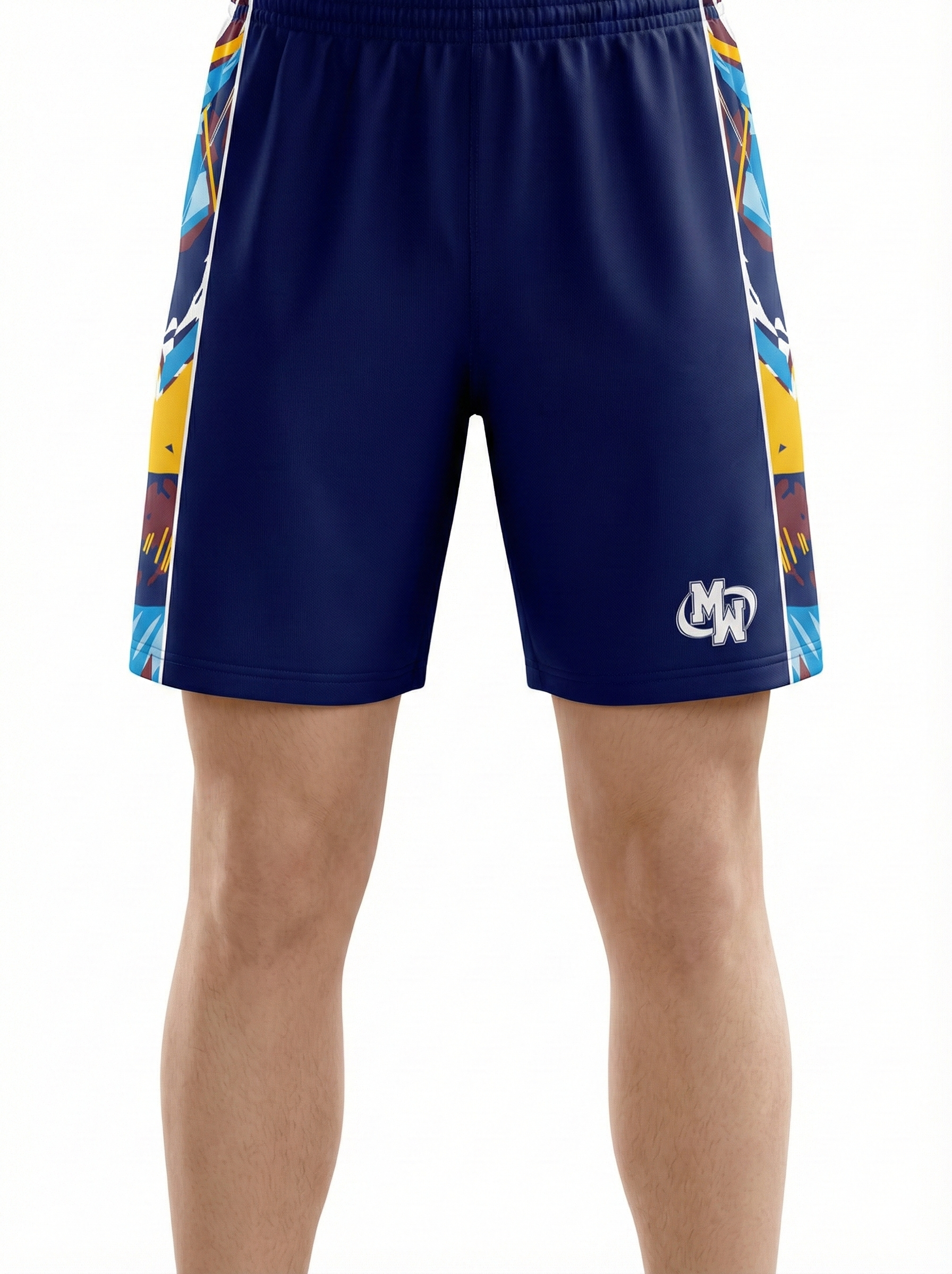 Striking Design Featuring a classic navy blue base, these shorts stand out with custom sublimated side panels showcasing a dynamic geometric pattern in blue, yellow, and maroon. The design is framed by crisp white piping that adds a professional finish, while the signature MW (Maania Wears) logo on the left leg represents quality craftsmanship.